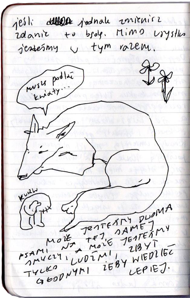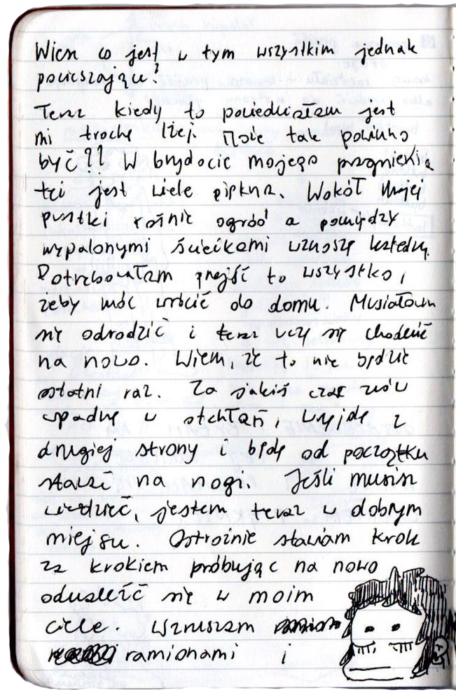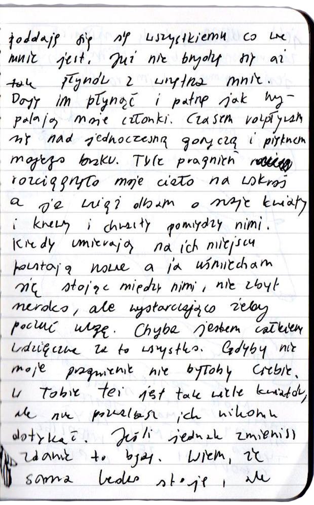 Teraz kiedy wypowiedziałam to wszystko jest mi lżej. Może tak powinno być. W brzydocie mojego pragnienia kryje się też wiele piękna. Wokół mojej pustki rośnie ogród a pomiędzy wypalonymi ścieżkami wznoszę katedrę. Potrzebowałam przejść to wszystko, żeby móc wrócić do domu. Musiałam się odrodzić i teraz uczę się chodzić na nowo. Wiem, że to nie będzie ostatni raz. Za jakiś czas znów wpadnę w swoją otchłań, wyjdę z drugiej strony i będę od początku wstawać na nogi. Jeśli musisz wiedzieć, jestem teraz w dobrym miejscu. Ostrożnie stawiam krok za krokiem próbując na nowo odnaleźć się w moim ciele. Wzruszam ramionami i poddaję się wszystkiemu co we mnie jest. Już nie brzydzę się aż tak płynów z wnętrza mnie. Daję im płynąć i patrzę jak wypalają moje członki. Czasem rozpływam się nad jednoczesną goryczą i pięknem mojego braku. Tyle pragnień rozciągnęło moje ciało na wskroś a ja wciąż dbam o swoje kwiaty i krzewy i chwasty pomiędzy nimi. Kiedy umierają na ich miejscu wzrastają nowe a ja uśmiecham się stojąc między nimi, nie zbyt szeroko, ale wystarczająco, żeby poczuć ulgę. Chyba jestem całkiem wdzięczna za to wszystko. Gdyby nie moje pragnienie nie byłoby Ciebie. W Tobie też jest tak wiele kwiatów, ale nie pozwalasz ich nikomu dotykać. Jeśli jednak zmienisz zdanie to będę. Wiem, że sama ledwo stoję, ale jeśli tylko chcesz to pomogę Ci wstać. Mimo wszystko jesteśmy w tym razem.